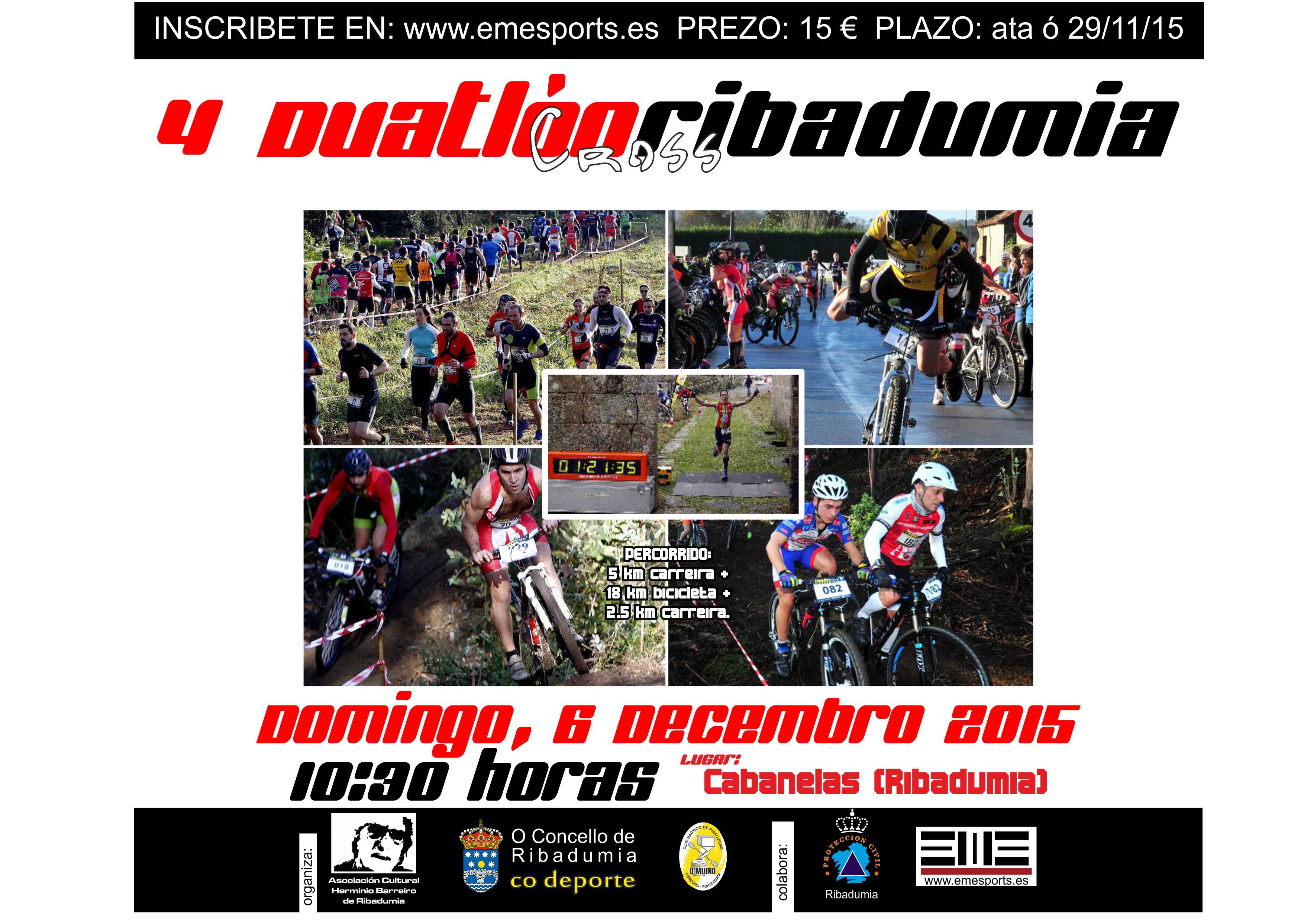 Membros da Asociación Herminio Barreiro e do Clube Naútico O Muiño de Ribadumia están a ultimar os preparativos para a celebración do IV DUATHLON CROSS RIBADUMIA – 2015. Dita proba terá lugar o Domingo 6 de Decembro, a partires das 10:30 da mañá, como nas ocasións anteriores, no entorno de Cabanelas – Ribadumia. Hai que resaltar que esta proba é a única do seu estilo no Salnés, sendo tamén xa un referente a nivel galego, tanto polas características técnicas da mesma, como polo entorno no que transcorre, ás beiras do Umia.